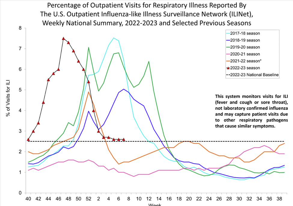 As many anticipated, the lack of exposure to common cold and influenza pathogens for two years led to an above average season for 2022-23. But it was not an unprecedented surge. The peak level of flu-like illness was very close to 2017-18.