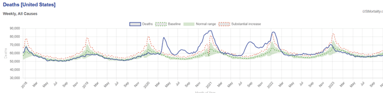 The USA was one of the countries with severe excess mortality during the COVID pandemic. Below is the graph from usmortality.com, covering the same period of time as the European graphs above: